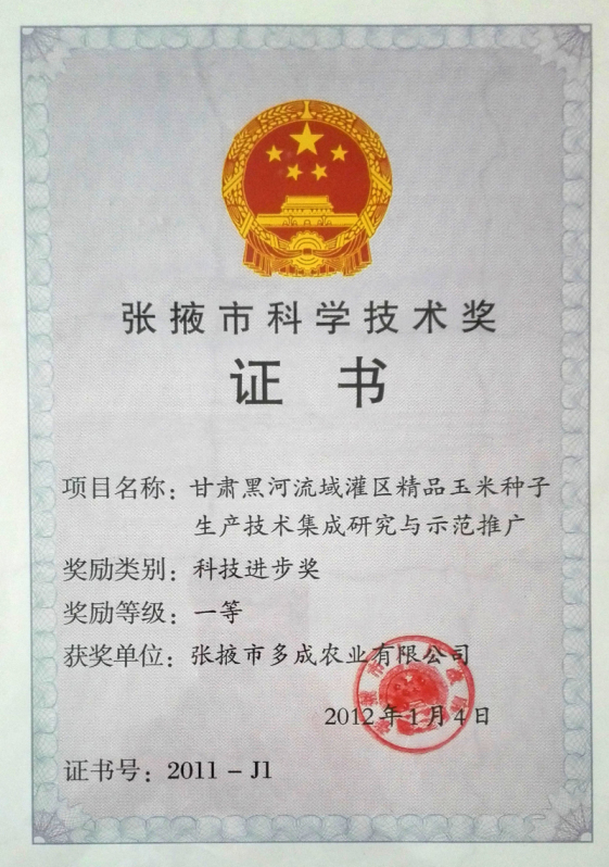 黑河流域精品玉米種子生產(chǎn)技術(shù)集成研究推廣科技進步一等獎