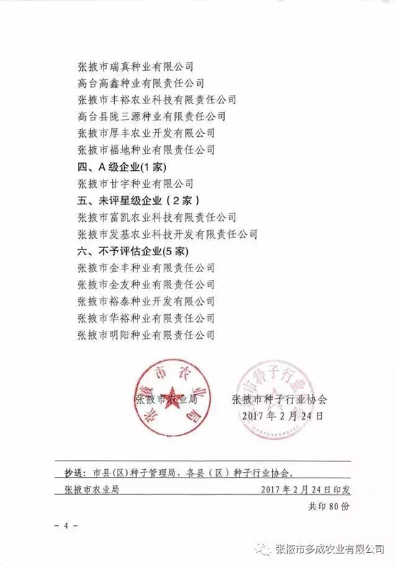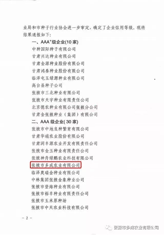 2017年2月24日,張掖市農(nóng)業(yè)局、張掖市種子行業(yè)協(xié)會(huì)公布的《2016年度玉米種子企業(yè)信用等級(jí)評(píng)估結(jié)果》中,張掖市多成農(nóng)業(yè)有限公司被評(píng)為2016年度信用等級(jí)AAA級(jí)企業(yè)。