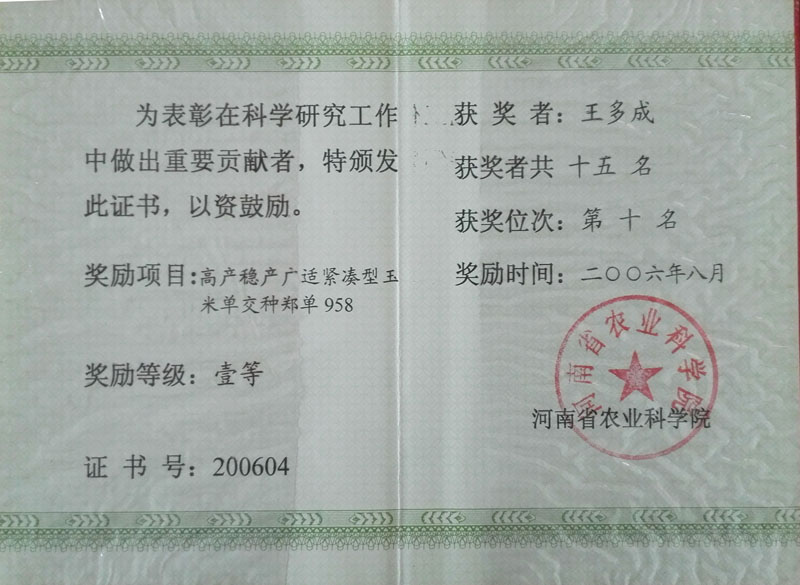 2006年榮獲河南省科學技術進步獎